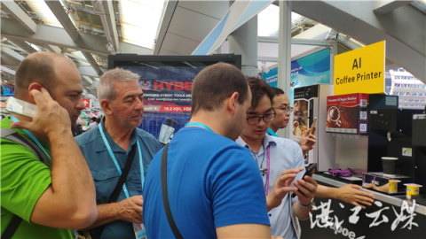 在廣交會(huì)天橋“共享空間”,不少外國(guó)客商興致勃勃地停留在湛江市新諾飲料設(shè)備制造有限公司的展位上,現(xiàn)場(chǎng)展示的全自動(dòng)人工智能咖啡機(jī)、咖啡拉花機(jī)、奶泡機(jī)等,都成為了全場(chǎng)矚目的焦點(diǎn)。