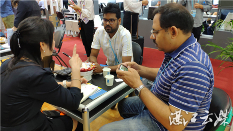廣東鴻智智能科技股份有限公司展位,外國(guó)客商在洽談