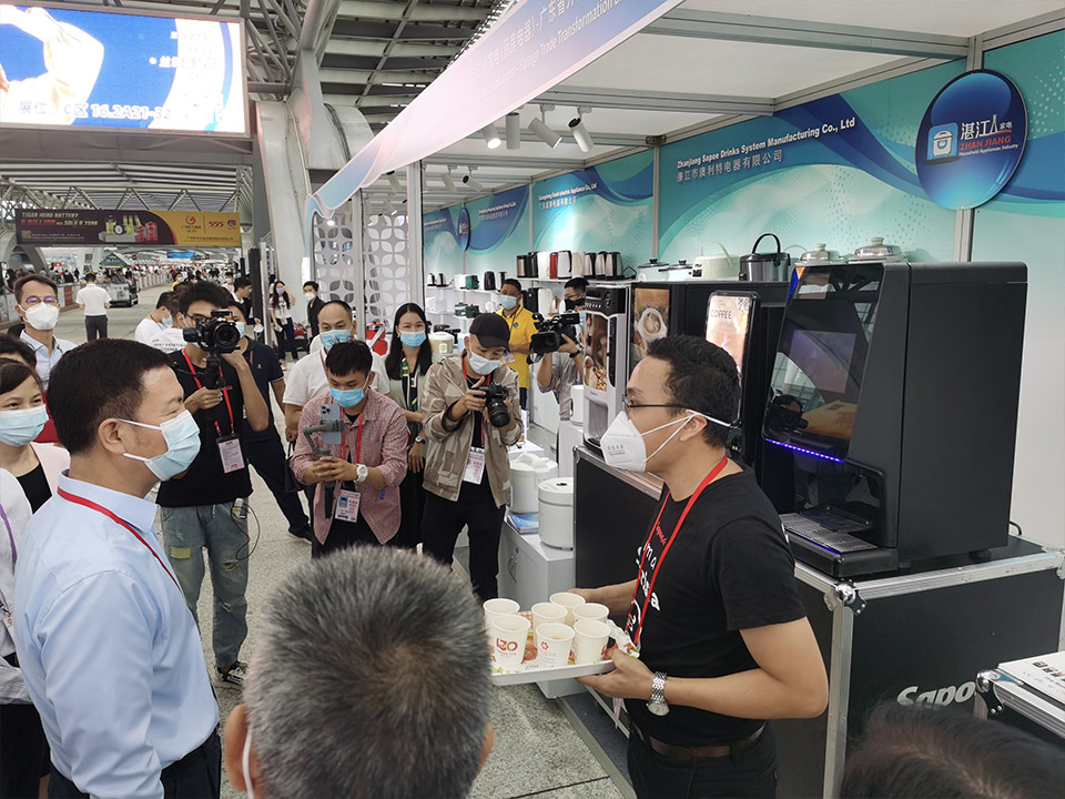 2021年10月15日-19日,湛江市新諾飲料設(shè)備制造有限公司參加由湛江市進(jìn)出口商會(huì)基地工作站組織在第130屆廣交會(huì)上舉辦的“湛江市小家電(廚房電器)外貿(mào)轉(zhuǎn)型升級(jí)示范基地”展示活動(dòng)。次活動(dòng)極好地向現(xiàn)場(chǎng)和線上的客戶宣傳推廣我司的全自動(dòng)智能咖啡機(jī)和全自動(dòng)智能飲料售賣機(jī)等,提升我司在國內(nèi)外市場(chǎng)的創(chuàng)造力、競(jìng)爭(zhēng)力和影響力。